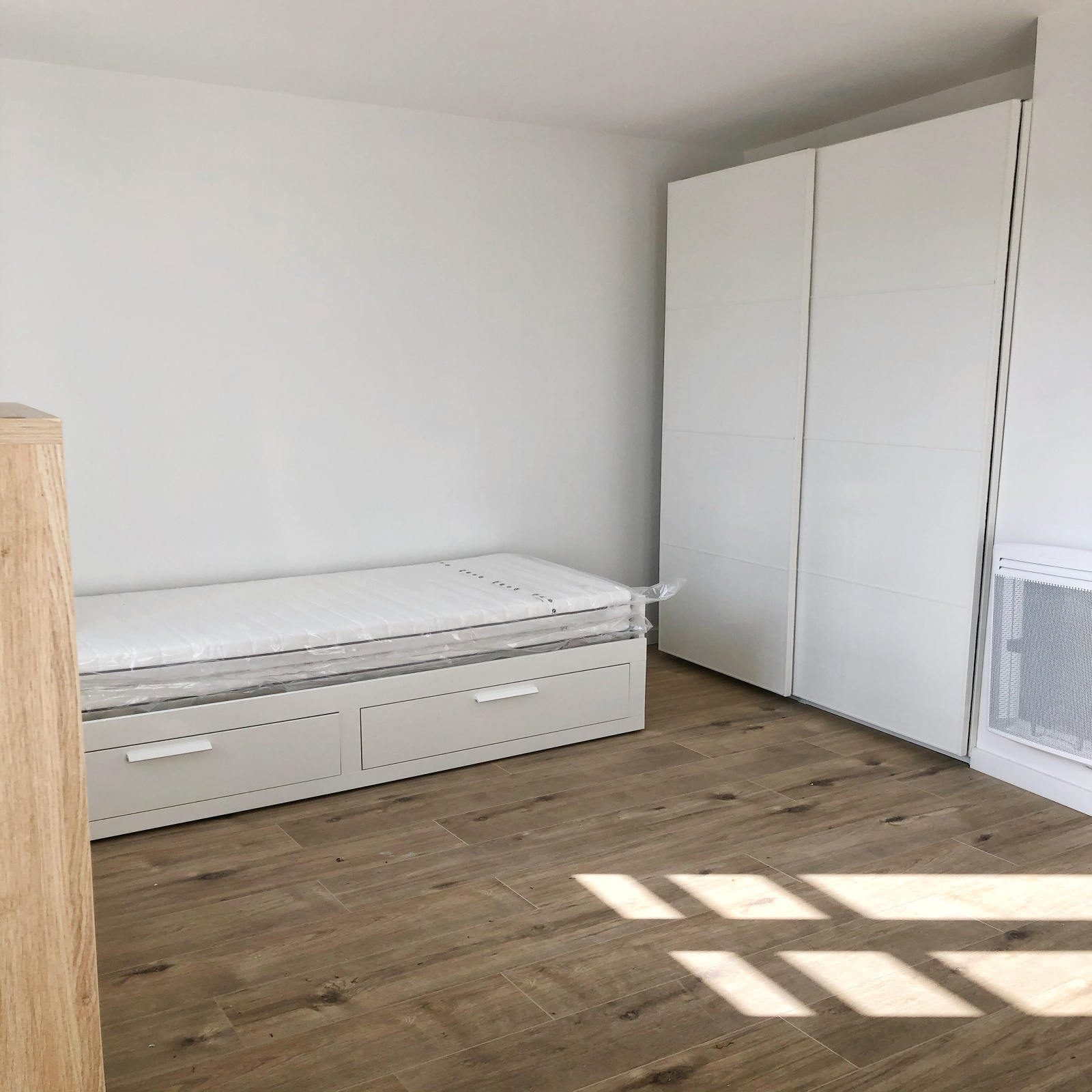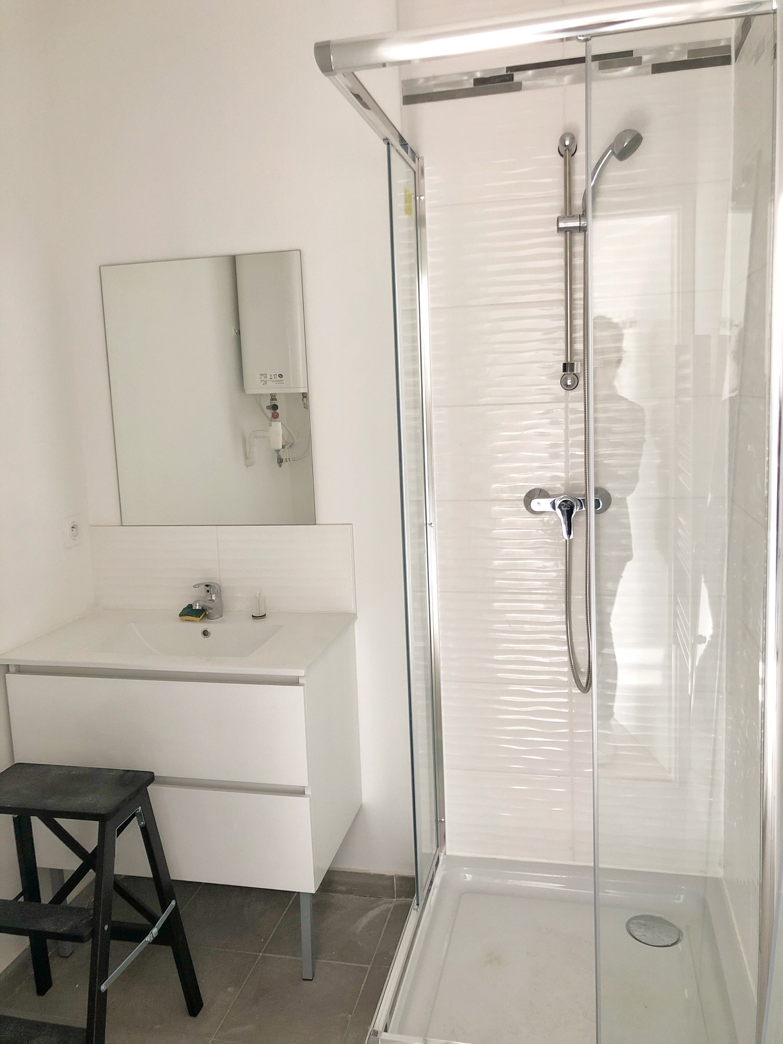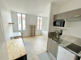 Entrée, cuisine équipée, séjour avec 2 fenêtres, placard et salle d'eau avec douche et WC.